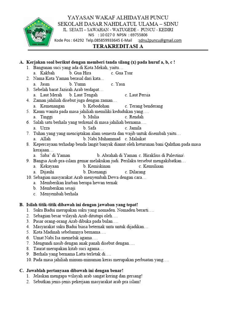 Berikut adalah berbagai jenis contoh soal yang dirancang untuk menguji pemahaman siswa kelas 3 MI tentang materi ski.