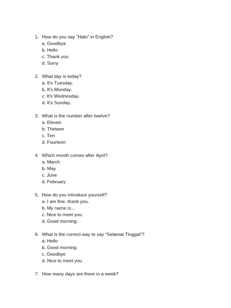 - Pilihan Ganda: Menguji pemahaman tentang lingkungan sekitar, keluarga, sekolah, pahlawan lokal, keragaman budaya, dan peta sederhana. Contoh: "Lagu kebangsaan Indonesia adalah… a. Maju Tak Gentar b. Indonesia Raya c. Garuda Pancasila d. Halo-halo Bandung".
